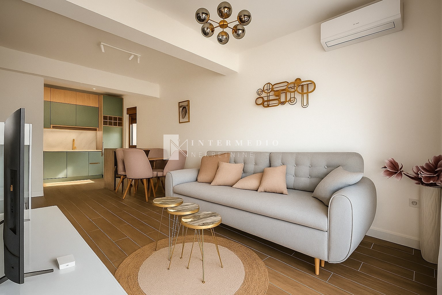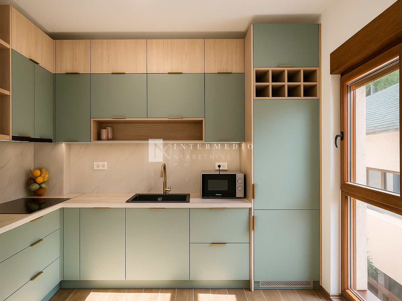 Stan je kompletno opremljen namještajem visokog kvaliteta, rađenim po mjeri, uz pažljivo birane materijale i detalje koji pružaju moderan, udoban ambijent.