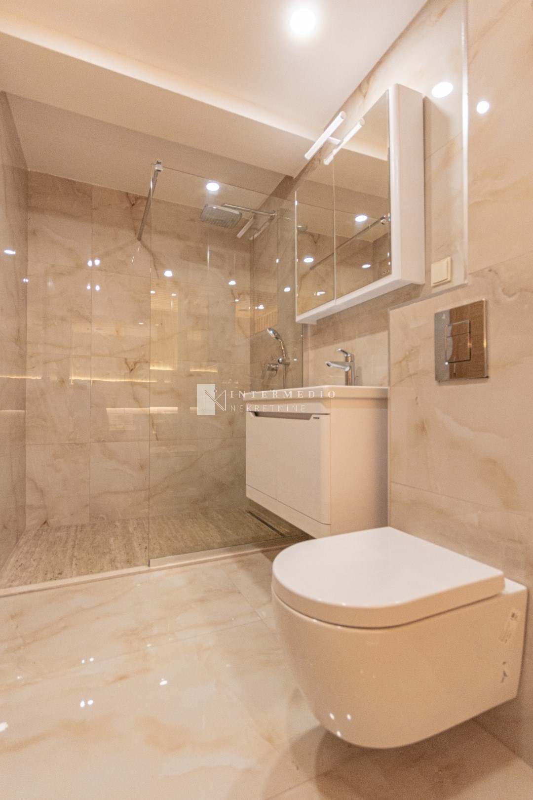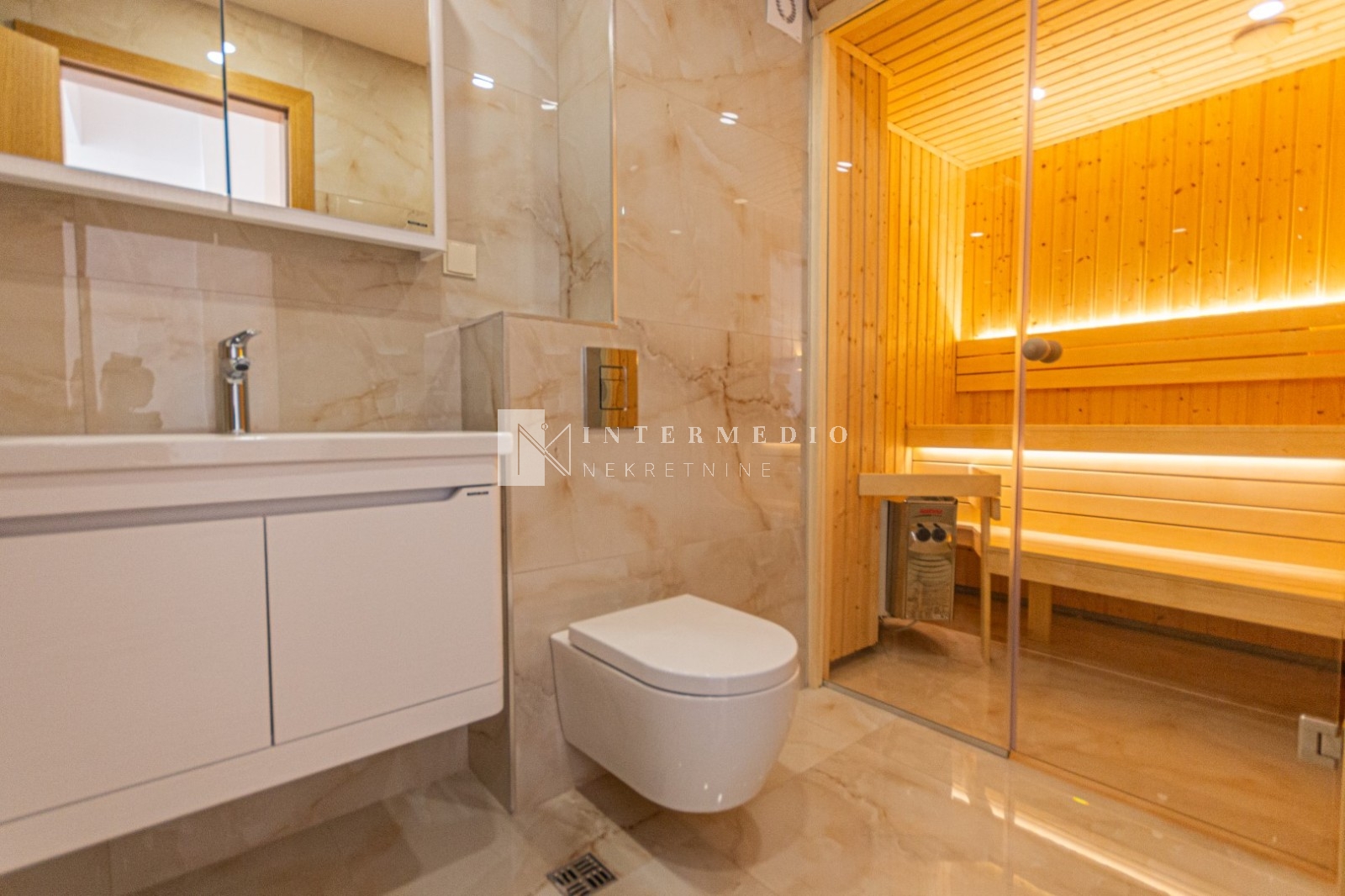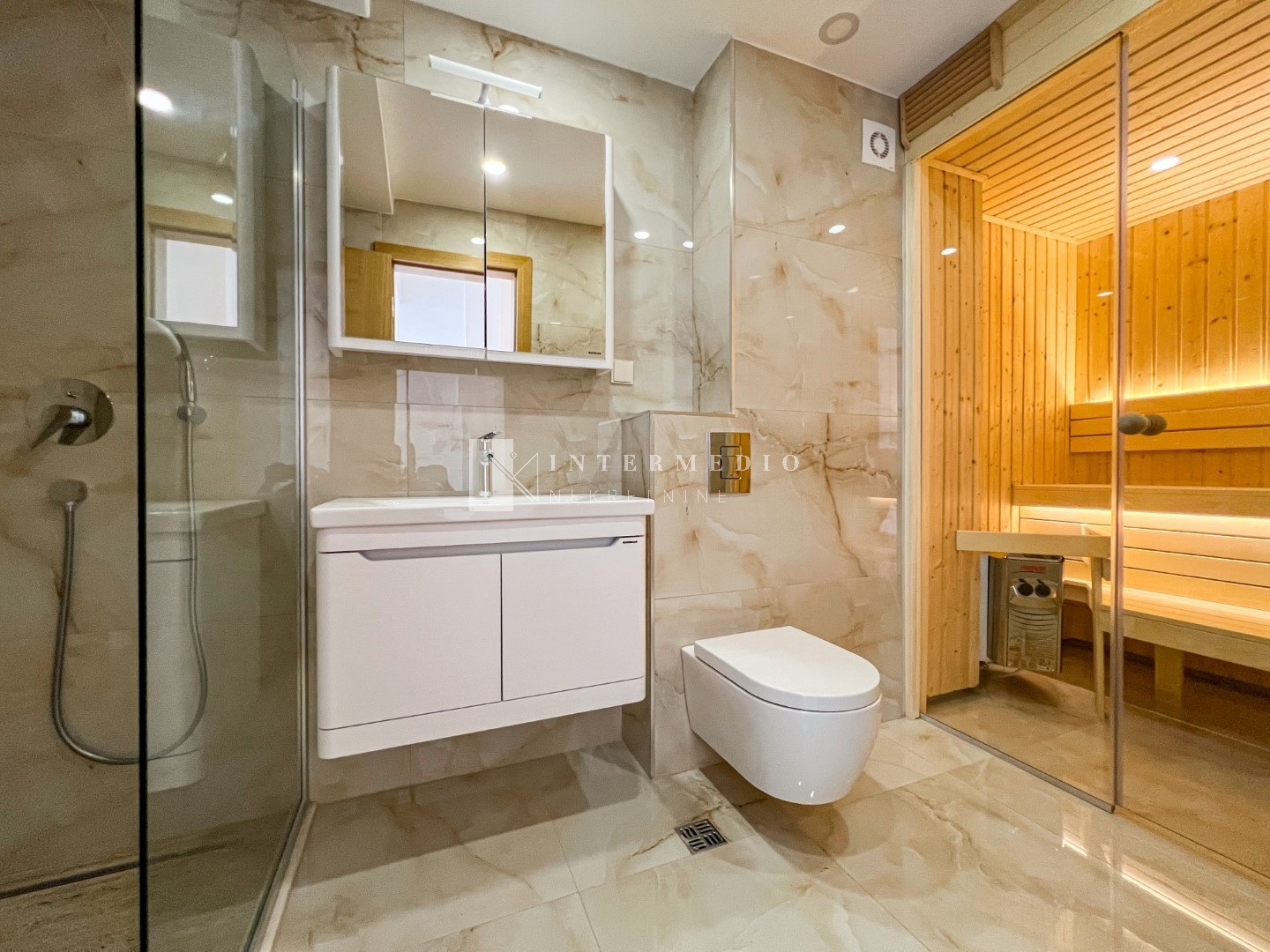 Stan je opremljen podnim grijanjem, multi split sistemom klima uredjaja u svakoj prostoriji, saunom, granitno poliranim plocicama i blind vratima italianskog proizvodjaca.