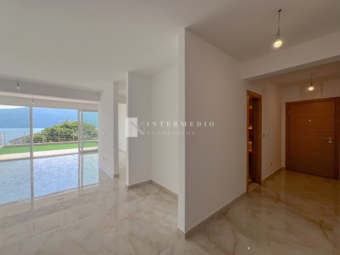 trpezarijom i velikim staklenim otvorima sa pogledom na more i izlazak na terasu koja ima dodatnih 18m2 svoje baste.